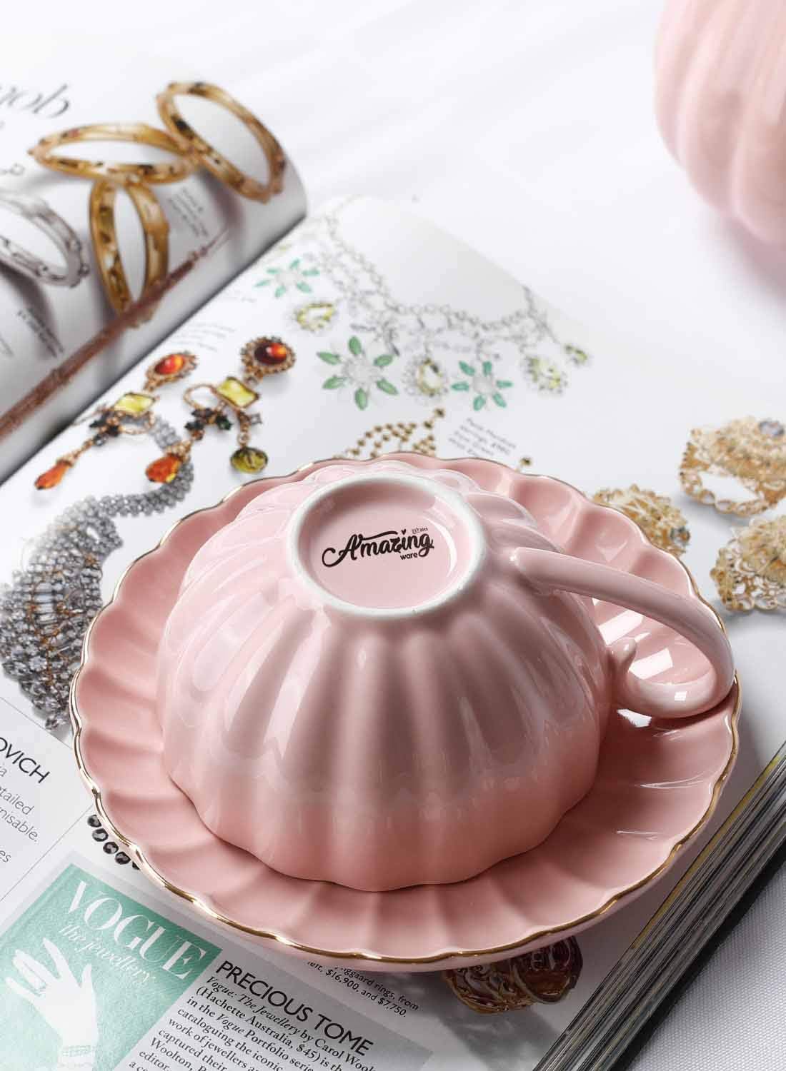 Amazingware Royal Tea Cups and Saucers, with Gold Trim and Gift Box, British Coffee Cups, Porcelain Tea Set, Set of 6 (8 oz)- Pink