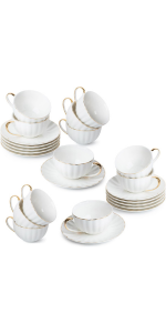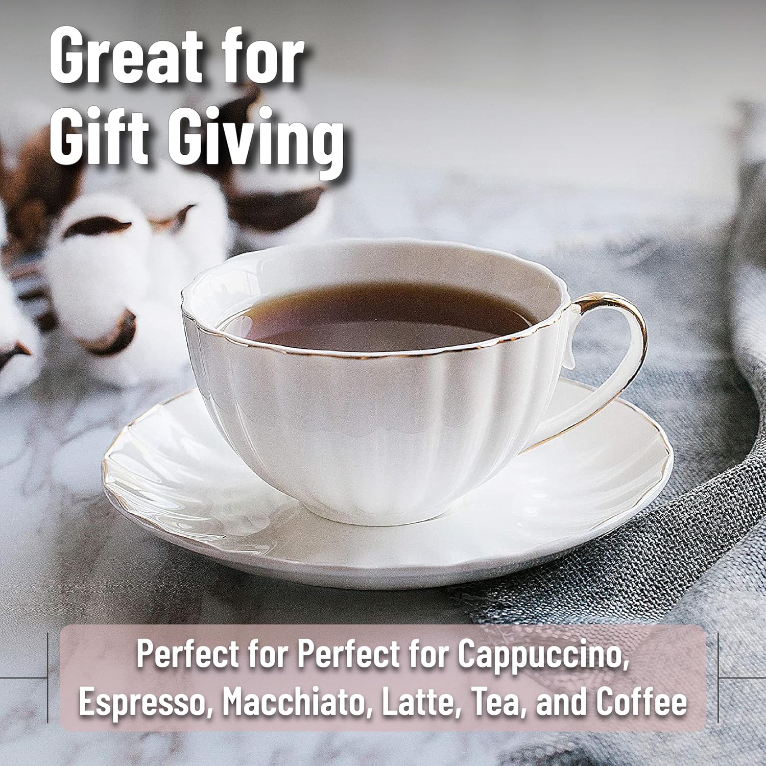 BTaT- White Tea Cups and Saucers Set of 12 (7 oz), Porcelain White Tea Cup Set of 12 with Golden Trim Design, Dishwasher Safe