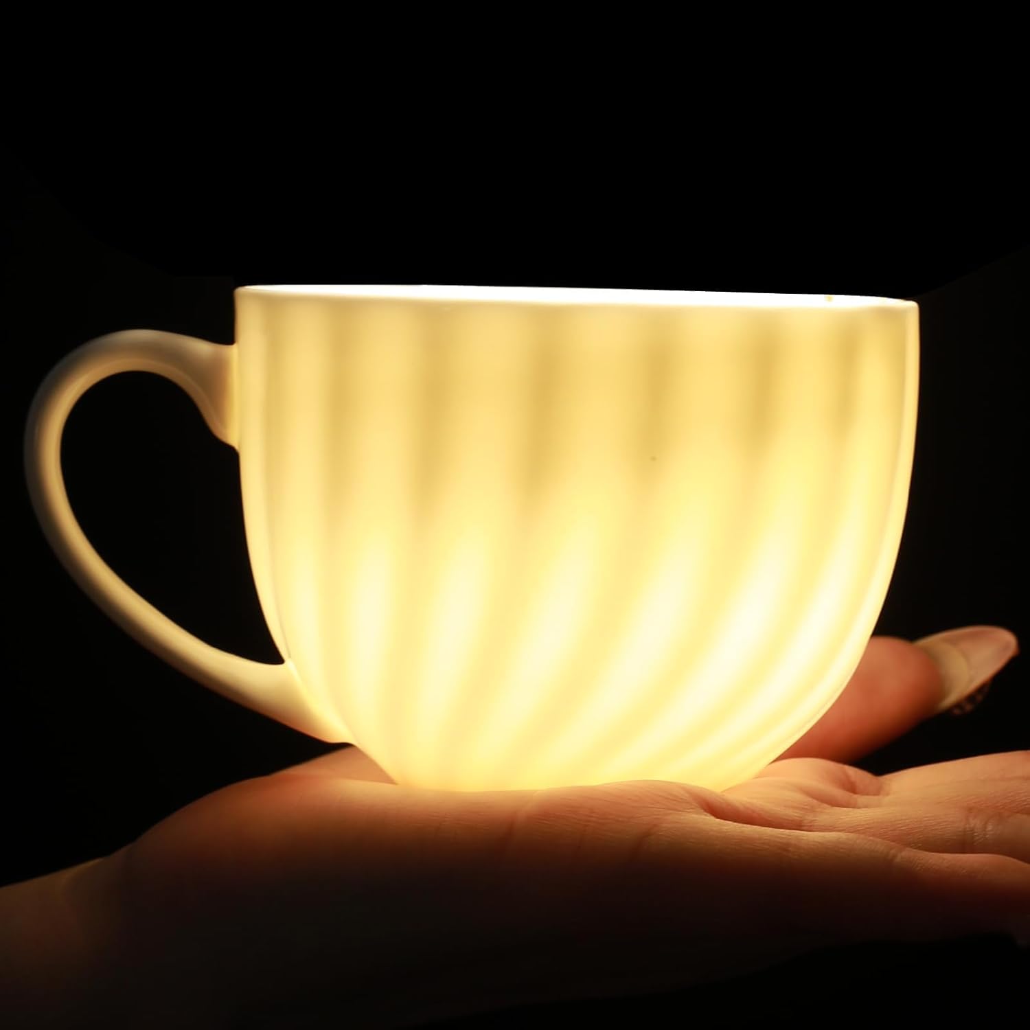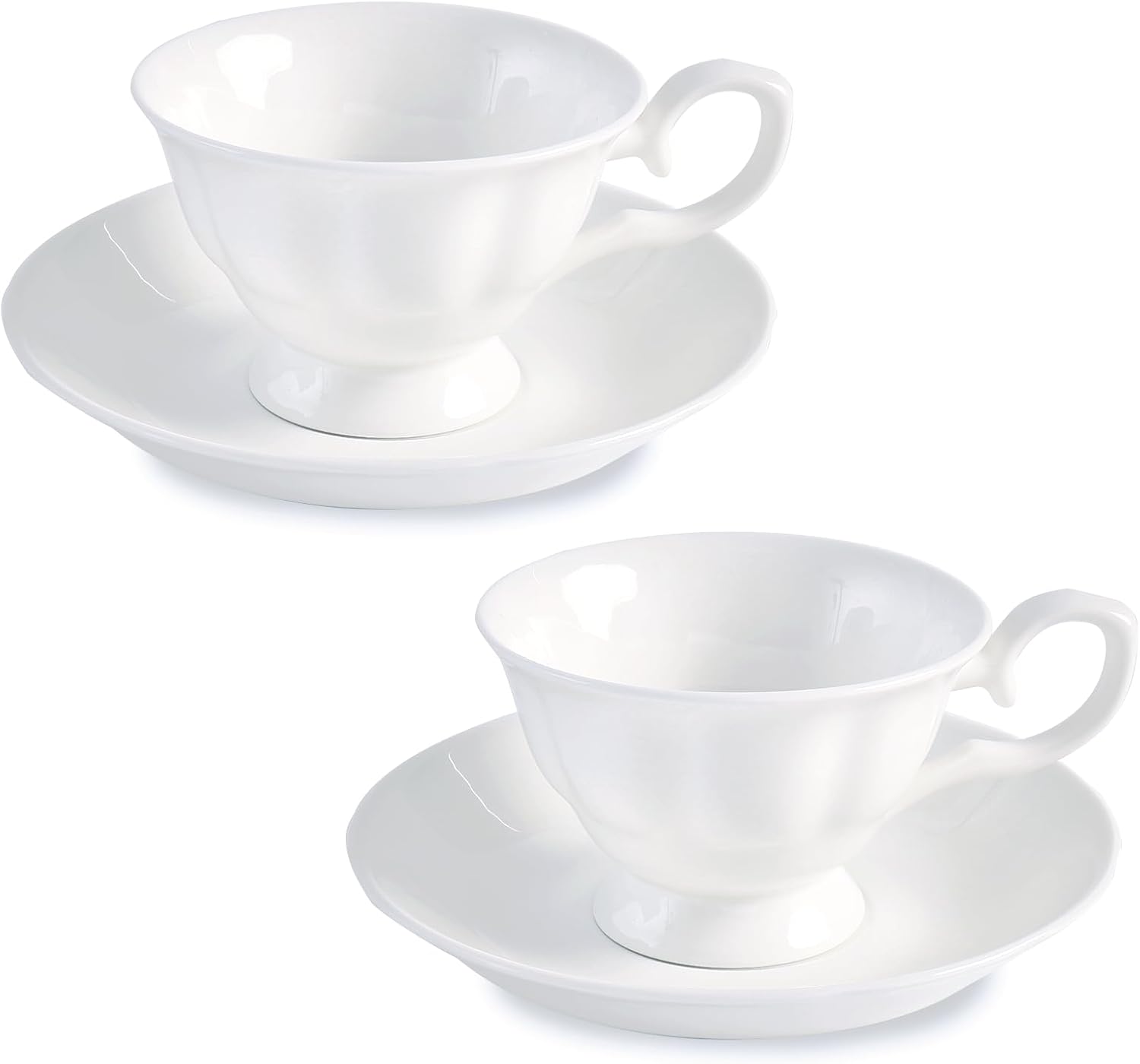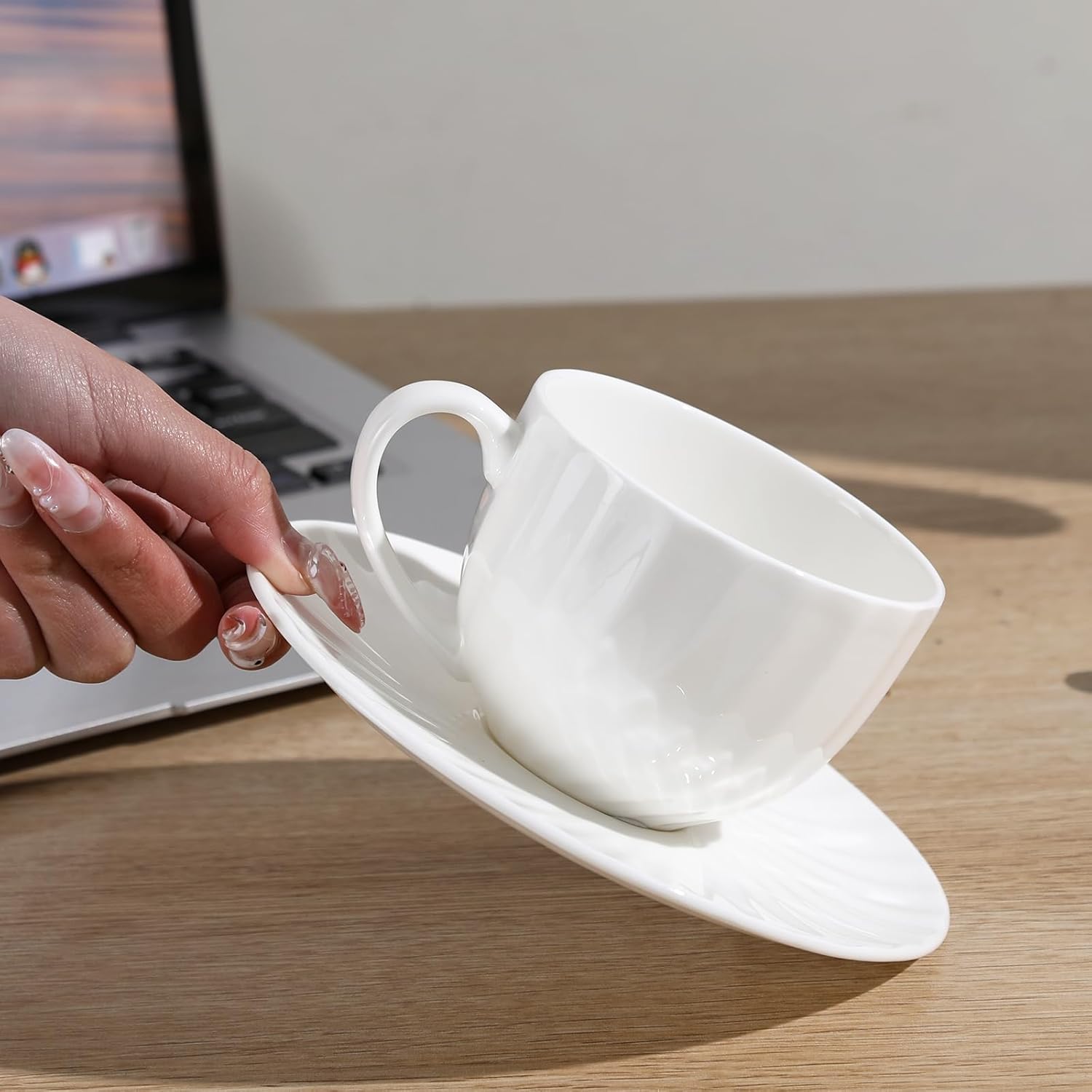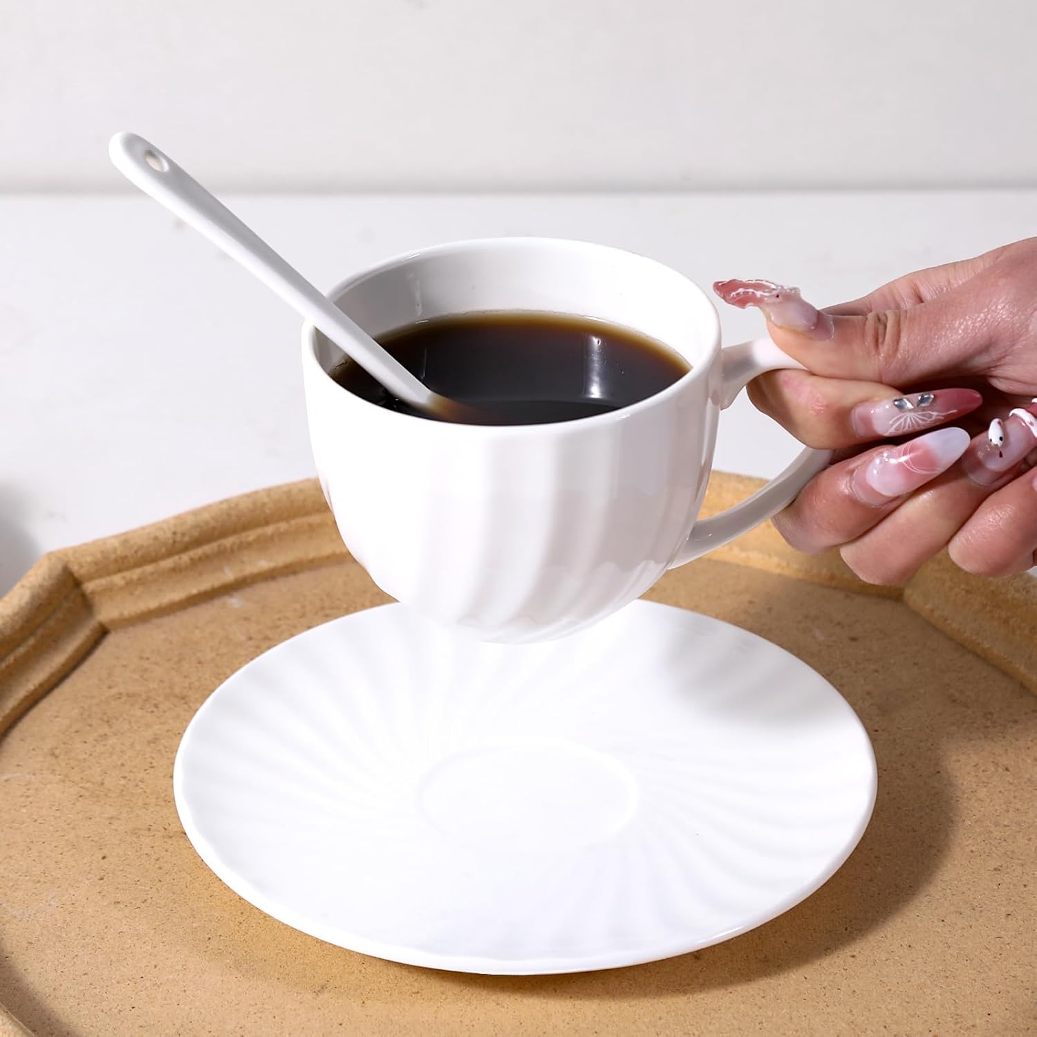 Fine Bone China Cappuccino Mugs Set of 4, 7 Oz Spiral Pattern Lightweight Ceramic, Art Coffee Cups with Saucers, for Latte, Mocha, Tea, Espresso, Macchiato, Americano