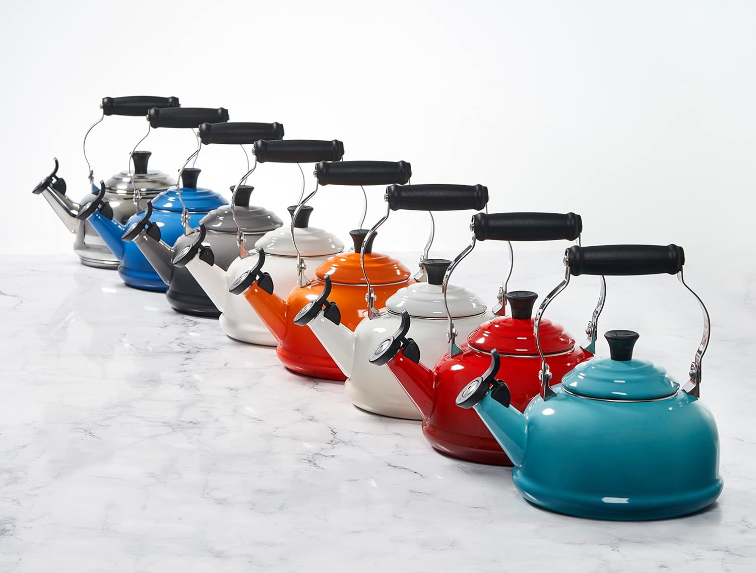 You won't let the water run dry when you hear the whistle of this tea kettle. Le Creuset constructs the traditional shape out of lightweight, sturdy steel and coats it with tough enamel. A shiny stainless-steel rim helps protect the edge from chipping and facilitates the lid positioning. The high handle can be locked in an upright position to keep your hand away from the heat, and a lever on the whistling device flips the spout open for pouring. Low and broad, the base allows maximum surface contact for faster boiling. Choose from many bright, modern colors to match or harmonize with your kitchen and other Le Creuset cookware. --Ann Bieri