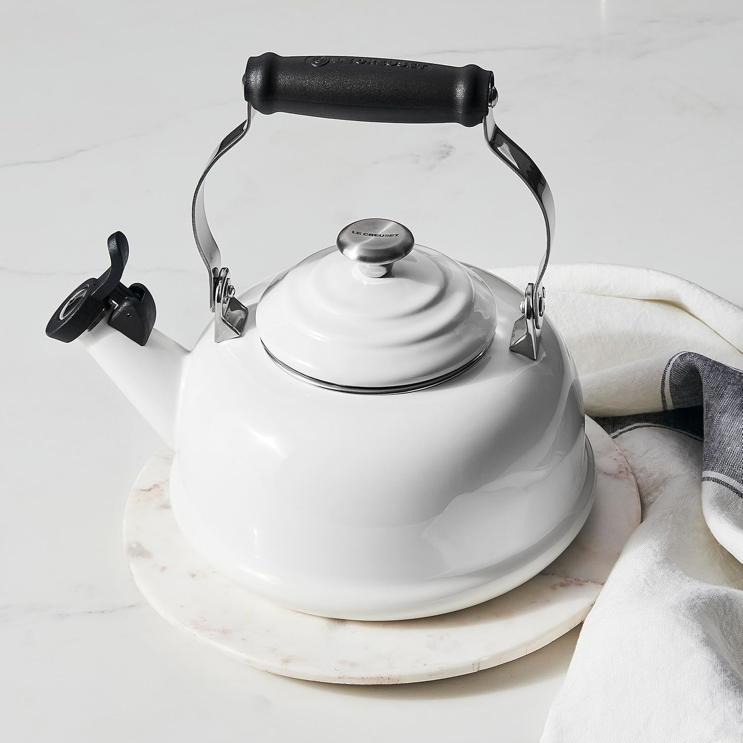 Le Creuset Enamel On Steel Whistling Tea Kettle with Metal Finishes, 1.7 qt., White