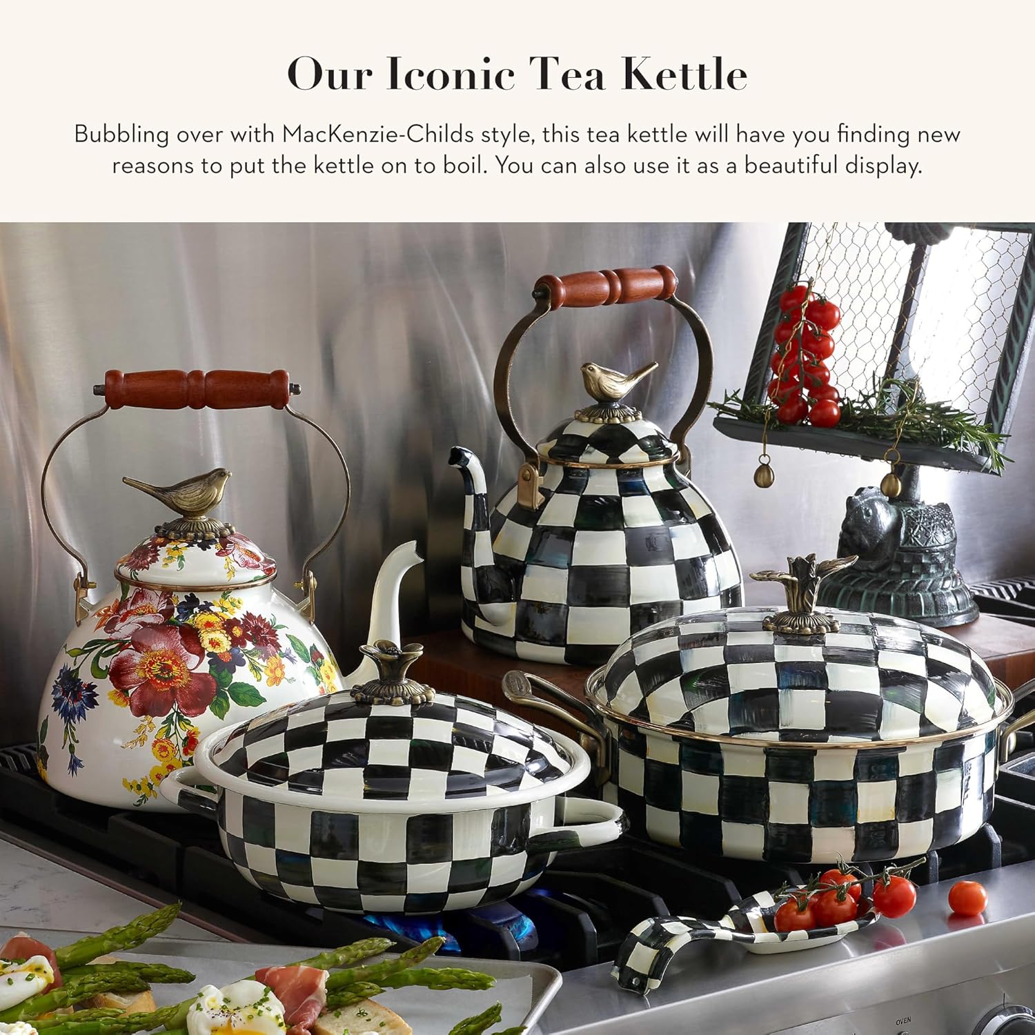 MACKENZIE-CHILDS Enamel Tea Kettle, Cute Kitchen Kettle for Stovetop, 3-Quart Capacity, White Flower Market with Bird Topper