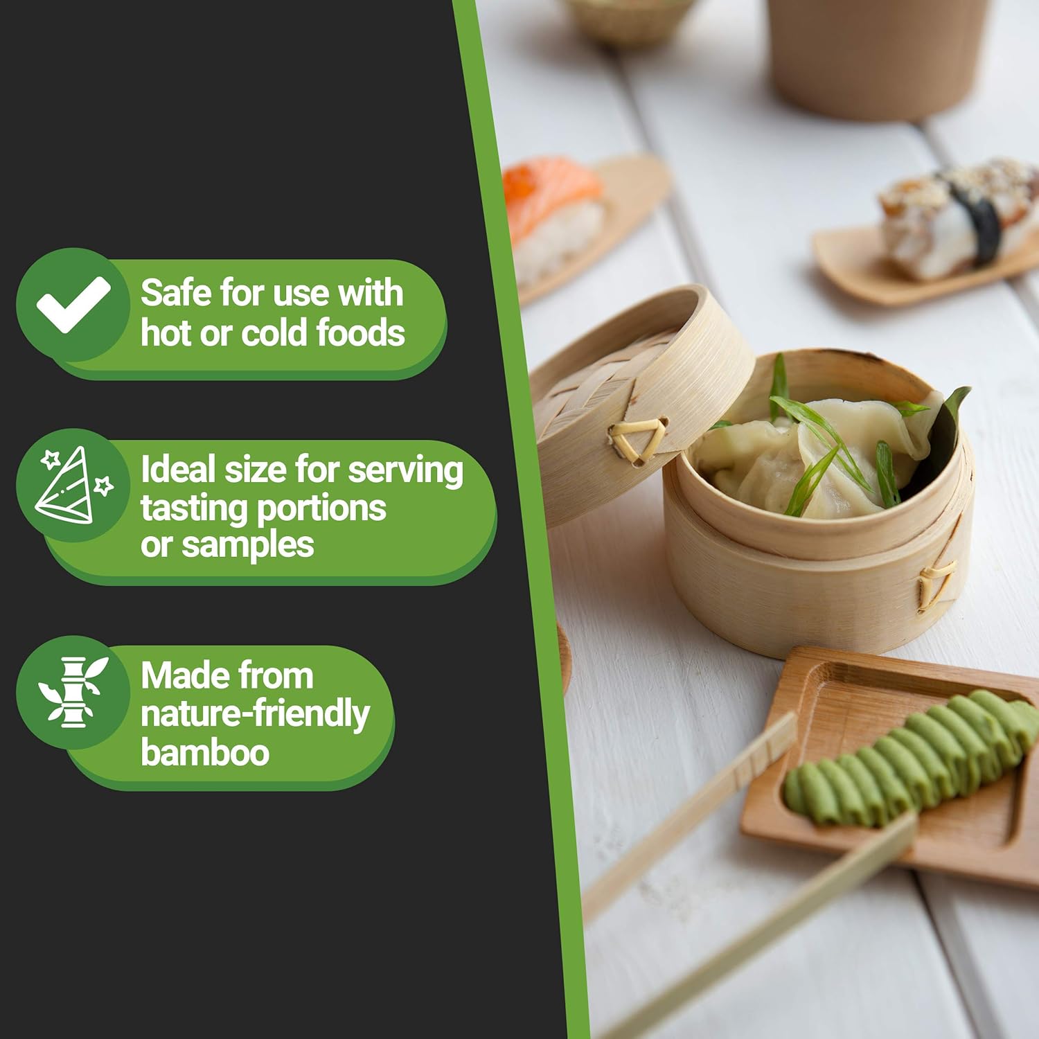 Keep mini servings of dumplings, vegetables, rice, or other cooked foods hot and flavorful with these charming miniature bamboo steamers from Restaurantware. Ideal for serving chopped up portions of chicken, fish, steamed broccoli, or small servings of dim sum, or noodles, these quaint food steamers bring a rustic, Asian-inspired style to any tablescape. Great for indoor and outdoor restaurants, catered events, banquets, or sushi bars, these steamers are sure to keep servings hot and ready. Moreover, they're constructed from all-natural bamboo, making them sustainable and nature-friendly. Each steamer comes with a neatly-fitted top and bottom slats for perfect food steamer serving. Each mini bamboo steamer measures 3.2 inches, holds 2 ounces and is shipped in bulk in a 100 count box.